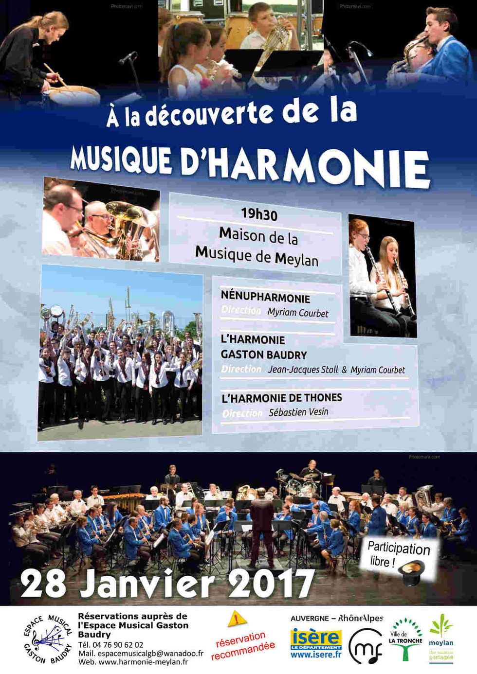 Venez découvrir la musique d’Harmonie le 28 janvier 2017 à la Maison de la Musique de Meylan. Trois orchestres se produiront pour vous : les enfants de la NénupHarmonie, l’Harmonie Gaston Baudry et enfin, l’Harmonie de Thônes qui vient de Haute-Savoie pour nous régaler. Venez nombreux !