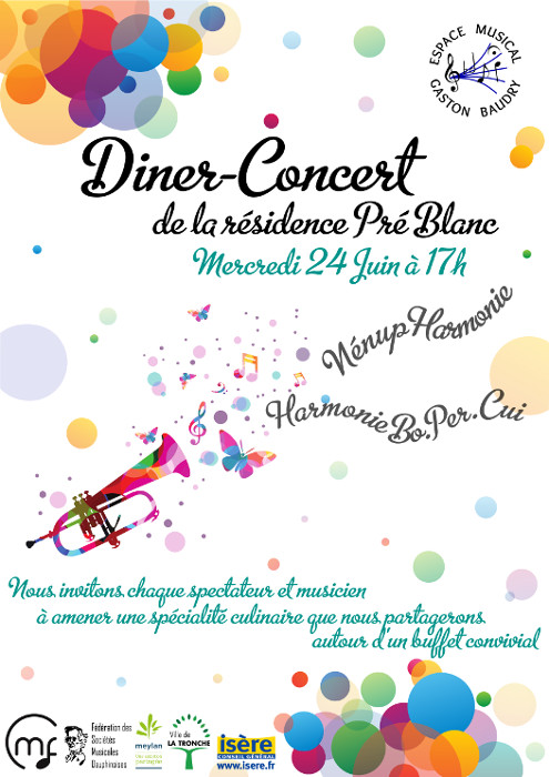 Les jeunes de l’EMGB vous proposent un dîner-concert à la résidence Pré Blanc, le mercredi 24 juin, à 17 h. La soirée sera animée par l’orchestre NénupHarmonie et l’Harmonie Bo.Per.Cui.